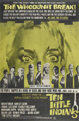 Ten Little Indians refers to the ten invitees, the familiar nursery rhyme and to Indian figures affixed to a serving plate at the castle. After the fatal poisoning of a guest, one figurine goes eerily missing. One down. Nine to go. Who’s next? That’s a fate Hugh O’Brien (TV’s Wyatt Earp), British screen veterans Leo Genn, Wilfrid Hyde-White and Stanley Holloway, and Goldfinger girl Shirley Eaton desperately hope to avoid.